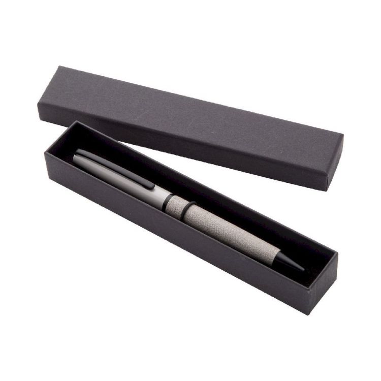Élégant stylo à bille twist en métal avec corps en PU et parties noires. Dans une boîte cadeau noire. Encre bleue.
