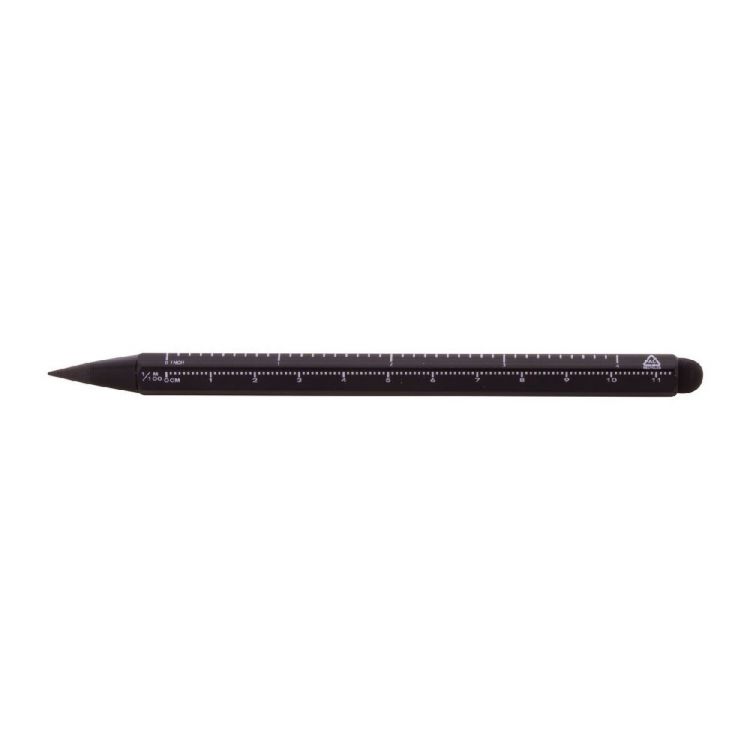 Stylo sans encre, longue durée en aluminium recyclé avec stylet tactile et pointe en alliage métallique, qui oxyde le papier. Avec forme hexagonale comprenant des règles de 11 cm et 4 pouces. Ce stylo écrit de la même manière qu'un crayon, et il est également effaçable.