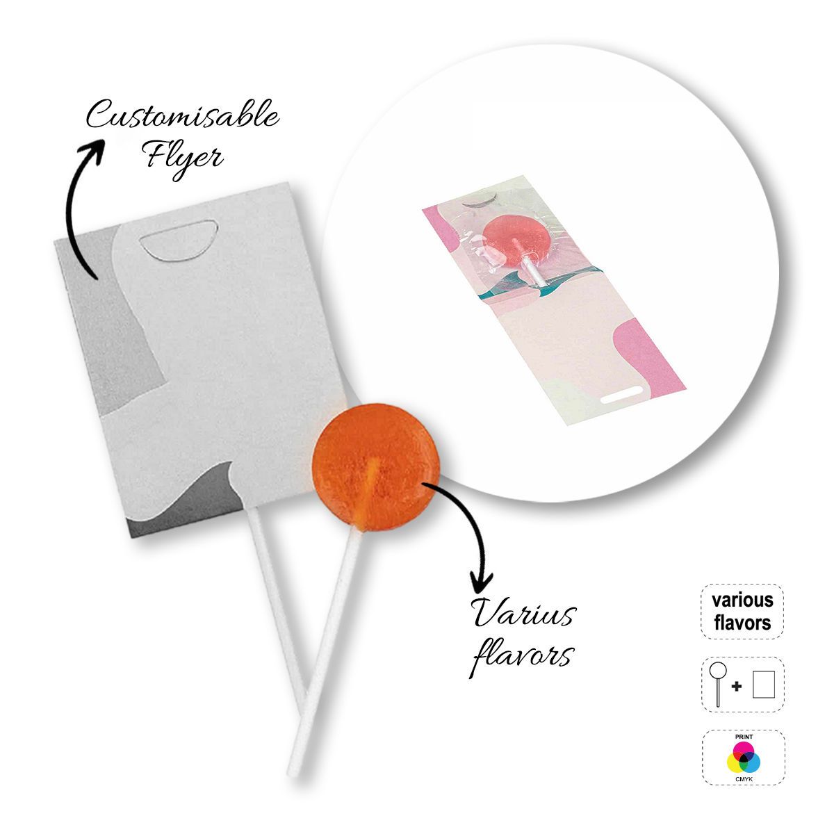 Sucette ronde et plate avec flyer de 7g. Les lettres du code produit correspondent à la forme du dépliant : A- rectangulaire, B- petit. Saveurs variées : fraise, pomme, orange et citron. Emballé avec un film transparent 100% compostable. Flyer entièrement personnalisable en papier 100 % biodégradable (finition du papier : blanc ou kraft à choisir lors de la commande). Bâton en papier. Durée de conservation minimale : 12 mois.