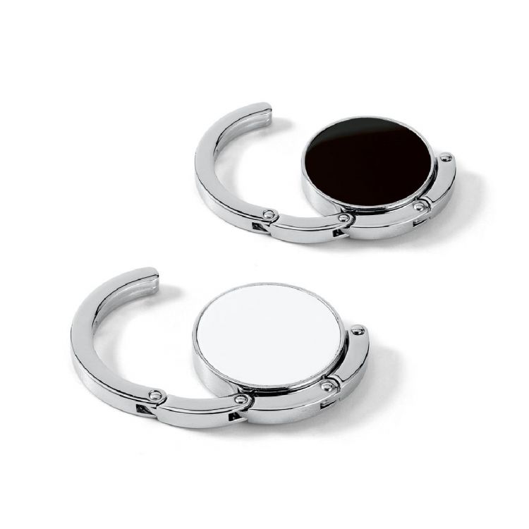 Support de sac en métal. Il se pose sur une surface pour suspendre votre sac. Une fois replié, il reste fixé à la base grâce à son aimant