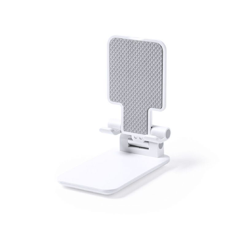 Support pliable pour smartphones et tablettes. Réglable en hauteur, il comprend des protections en caoutchouc antidérapantes sur la base et le support. En finition blanche sobre et avec une grande surface de marquage, particulièrement adapté à la tampographie. Présenté dans une boîte de design attrayante. (couleur blanche)