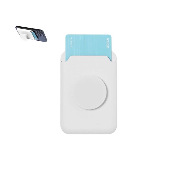 Porte-carte avec support pliable pour smartphone. Conçu pour garder jusqu'à deux cartes, inclut un anneau métallique adhésif pour une fixation et un anneau amovible et ajustable pour un meilleur usage, en couleur brillante.