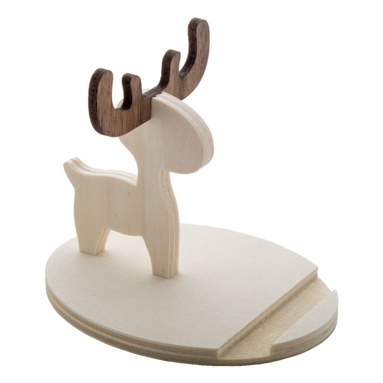 Support pour téléphone en bois de bouleau en forme de renne. Livré déplié
