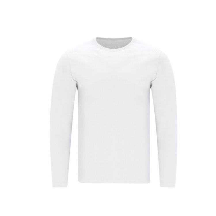 T-shirt à manches longues pour adultes de couleur blanche, doux et agréable au toucher en jersey lisse 100% coton, 160 g/m². Fabriqué en tissu tubulaire, avec encolure ronde en côte 1x1 et couture renforcée assortie en blanc.