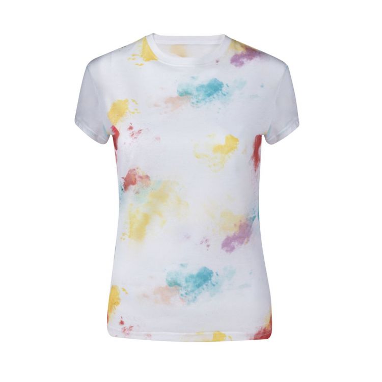 T-shirt pour femme en 100% polyester respirant 160g/m2 avec texture coton. Avec un col rond et un design audacieux avec des motifs inspirés d’une palette de peintures. Disponible en tailles S, M, L, XL.
