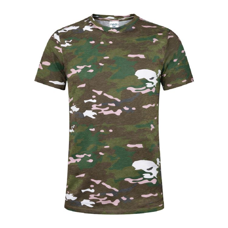T-shirt unisexe imprimé camouflage. Fabriqué en 100% coton peigné Ring Spun de 150g/m2. Toucher doux et coupe moderne. Col rond étroit en côte 2x2. Double couture sur l'ourlet et les manches pour une plus grande durabilité et résistance à un usage intensif. Étiquette facilement amovible. Disponible en tailles XS, S, M, L, XL et XXL.