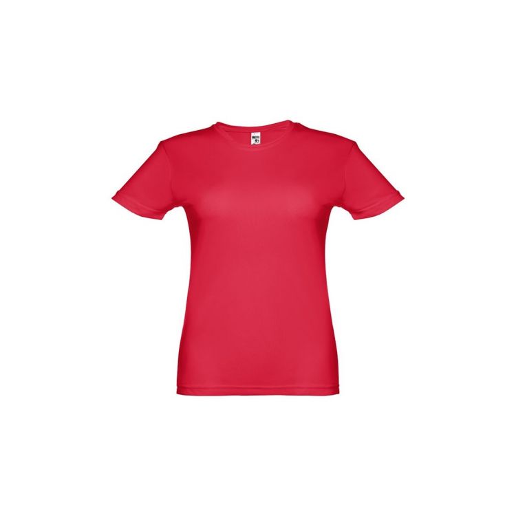 T-shirt technique pour femme à manches courtes, légèrement ceinturé, en maille jersey 100% polyester (130 g/m²). Coupe régulière et tissu confortable et respirant. Contient une bande de renfort sur le col en jersey et une double couture sur les manches et le bas. Produit en couleur rouge