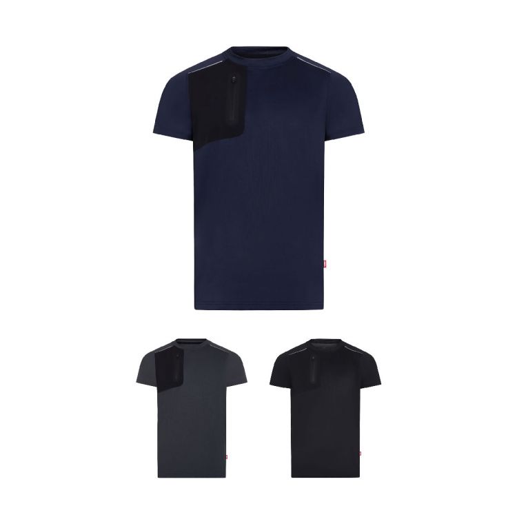 T-shirt technique en tissu gaufré (110 g/m²), 100 % polyester recyclé. Modèle confortable, col rond, manches raglan et détails réfléchissants sur les épaules et dans le dos. La poche poitrine en polyester EME est dotée d'une fermeture à glissière thermosoudée
