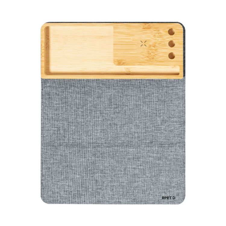 Tapis de souris pliable en polyester RPET avec base en silicone. Avec chargeur rapide sans fil intégré (15W) et support de téléphone portable en bambou. Polyester 300D RPET. Câble de chargement USB inclus, de couleur gris foncé