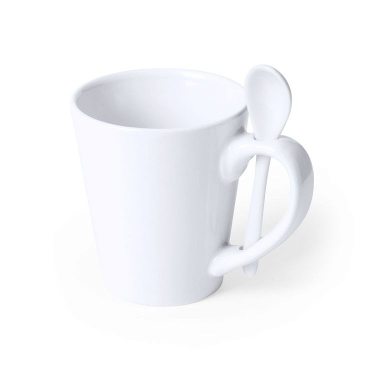 Mug blanc en céramique d´une capacité de 350ml avec cuillère en céramique intégrée dans l´anse. Spécialement conçu pour le marquage en sublimation. Présenté en boîte individuelle.Manuel d'instructions disponible en espagnol et en anglais. (couleur blanche)