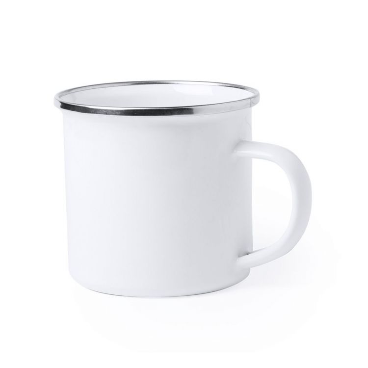 Tasse en métal de design rétro et capacité de 380ml, avec de petites imperfections pour un look vintage. Spécialement conçue pour le marquage en sublimation, avec anneau chromé élégant et présenté dans la boîte individuelle. (couleur blanche)