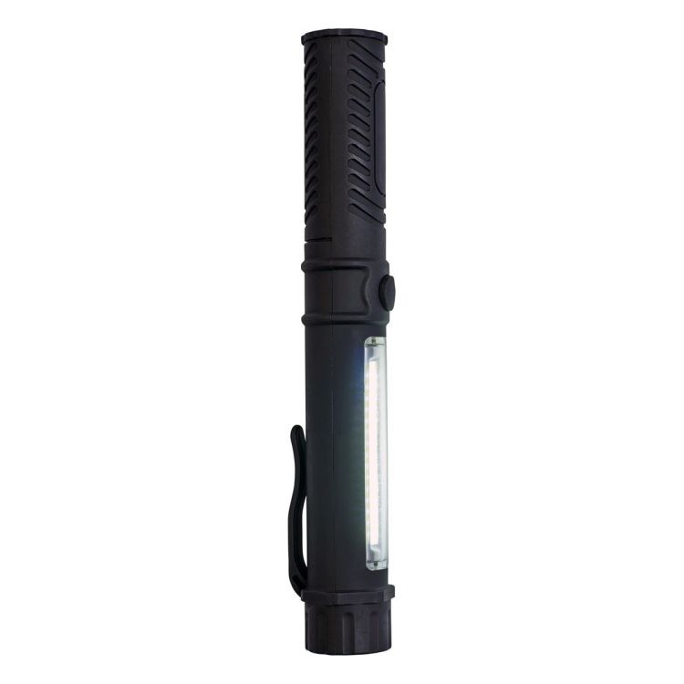 Torche en ABS munie de LEDS COB et d'une LED blanche, équipée d'un aimant et d'une pince, piles incluses.