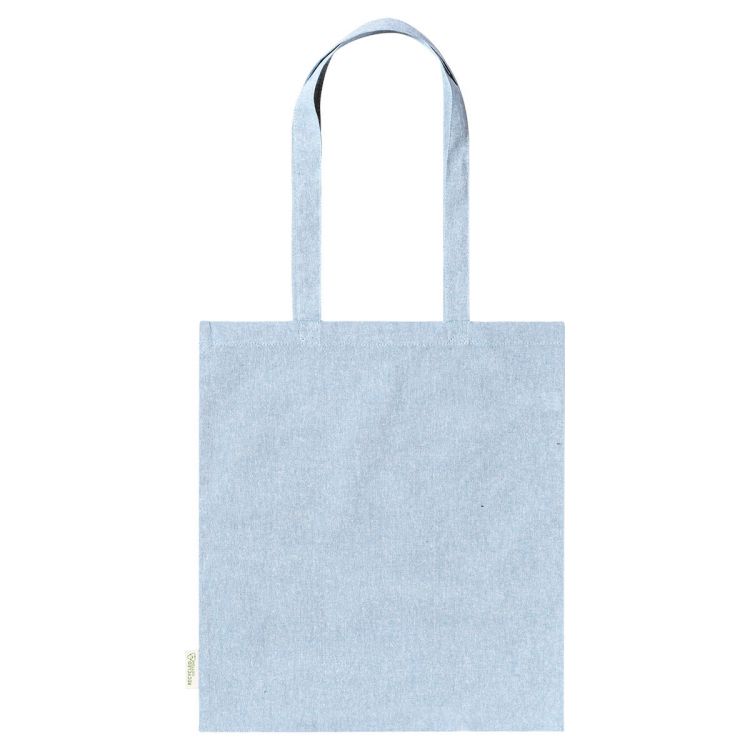 Tote bag réutilisable en coton recyclé avec de longues poignées et une étiquette distinctive coton recyclé. 100% coton recyclé, 140 g/m².