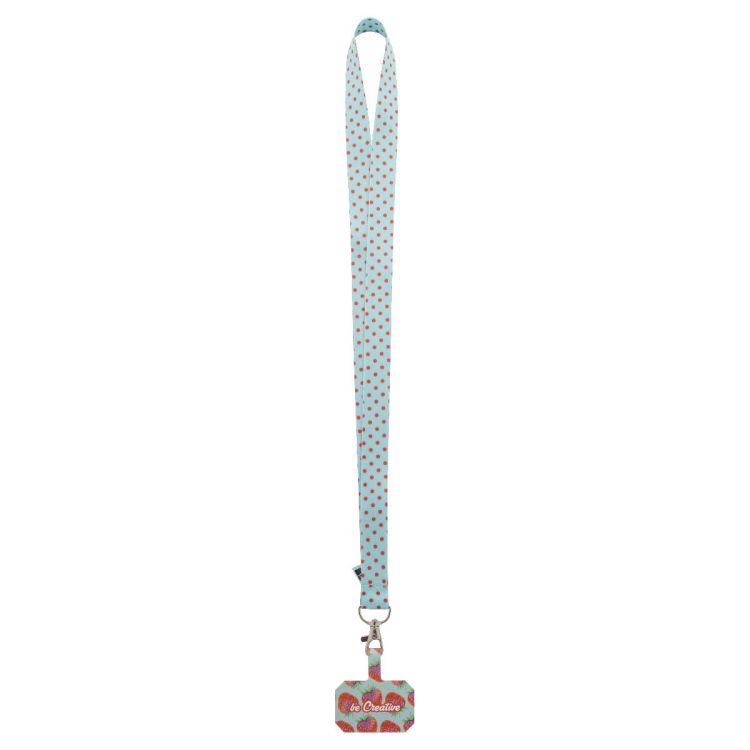 Tour de cou personnalisable en RPET avec mousqueton en métal et insert de téléphone imprimé en quadri dans un papier indéchirable. Impressions par sublimation sur les deux faces. Quantité minimale : 100 pièces