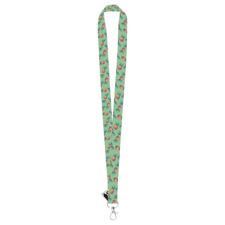 Tour de cou en RPET avec mousqueton en métal. Impression en sublimation sur les 2 côtés. Quantité minimum: 100 pièces