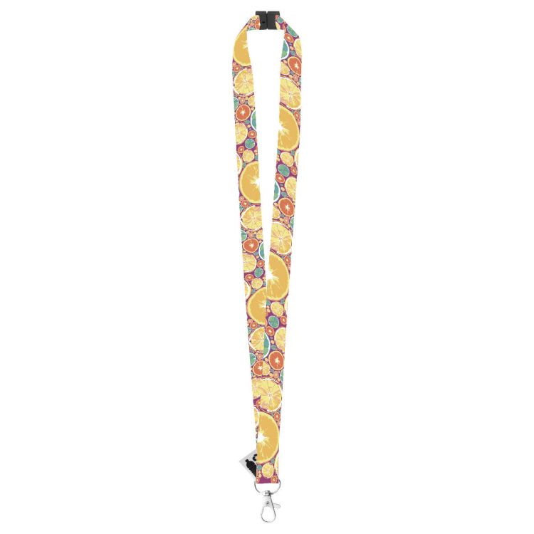 Tour de cou en RPET avec mousqueton en métal avec système anti-étranglement. Impression en sublimation sur les 2 côtés. Quantité minimum : 100 pièces