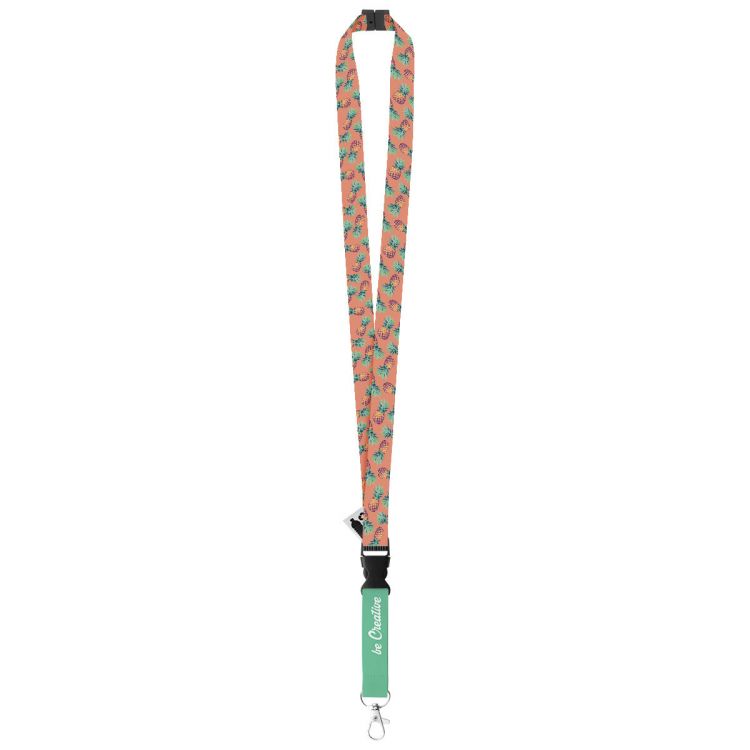 Tour de cou en RPET avec mousqueton en métal avec système anti-étranglement. Impression en sublimation sur les 2 côtés. Quantité minimum: 100 pièces