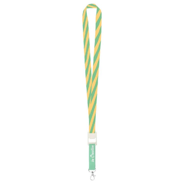 Tour de cou en polyester avec mousqueton en métal et porte-bouteille. Grâce à la sublimation le logo peut être imprimé sur les deux côtés. Quantité minimale : 100 pcs