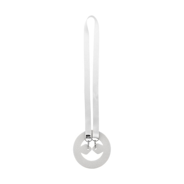 Tour de cou RPET avec mousquetons métalliques et porte-gobelet impression quadri en feutrine RPET. Sublimation sur les deux faces. Quantité minimale : 100 pièces