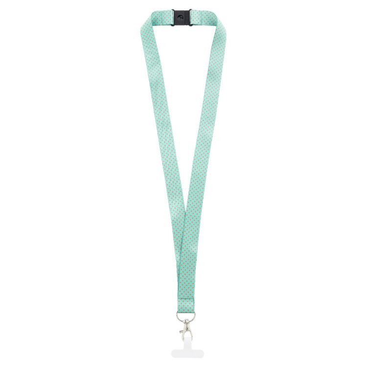 Tour de cou support téléphone portable en RPET, fabriqué sur mesure, avec mousqueton en métal et insert pour téléphone en papier indéchirable et système anti-étranglement. Impression sur base de quadri en sublimation sur les deux faces. Quantité minimale : 100 pièces.