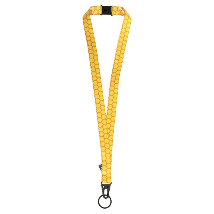 Tour de cou en RPET personnalisable avec mousqueton tactique en métal noir, anneau porte-clés et boucle de sécurité. Impression en sublimation recto verso. Quantité minimale : 100 pièces, de couleur noir