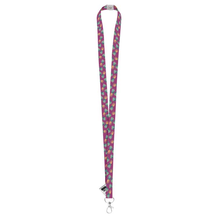Tour de cou en RPET de 15 mm de large sur mesure avec mousqueton en métal et système anti-étranglement en plastique paille de blé. Sublimation des deux faces. Quantité : 100 pièces