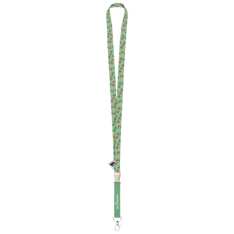 Tour de cou en RPET de 15 mm de large sur mesure avec mousqueton métallique amovible et boucle en plastique paille de blé. Sublimation des deux faces. Quantité minimum : 100 pièces