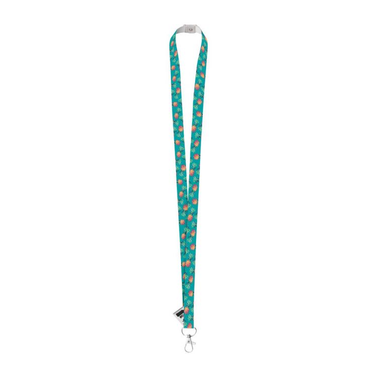 Tour de cou en RPET sur mesure de 15 mm de large avec mousqueton en métal et boucle de sécurité en plastique paille de blé. Sublimation sur une face. Quantité minimum : 100 pièces