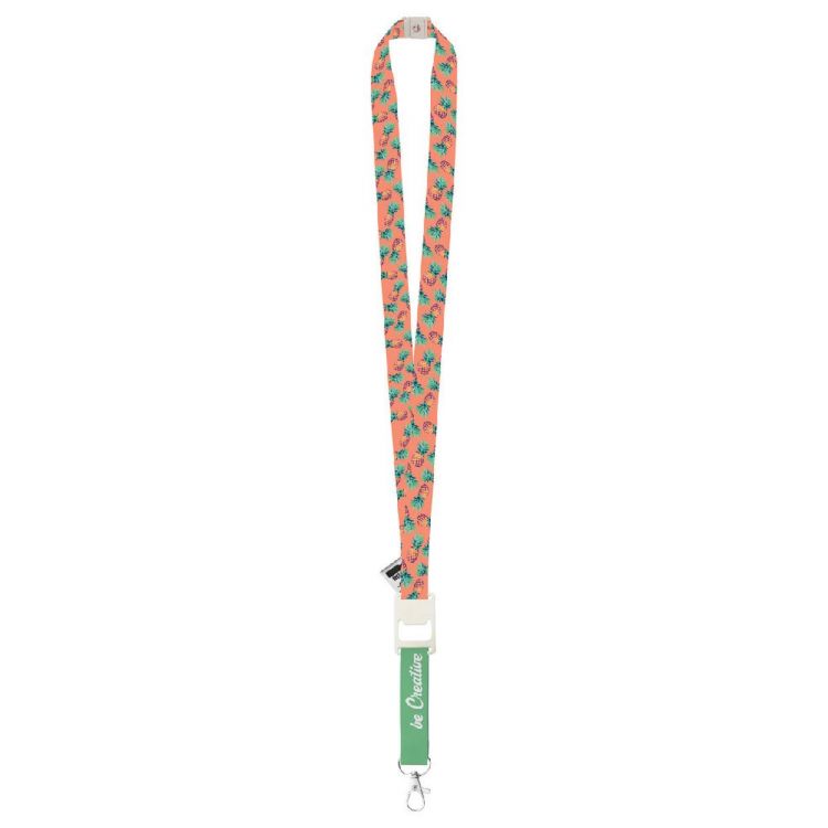 Tour de cou en RPET sur mesure avec mousqueton et décapsuleur en métal et système anti-étranglement en plastique paille de blé. Impression en sublimation sur les deux faces. Quantité minimale : 100 pièces