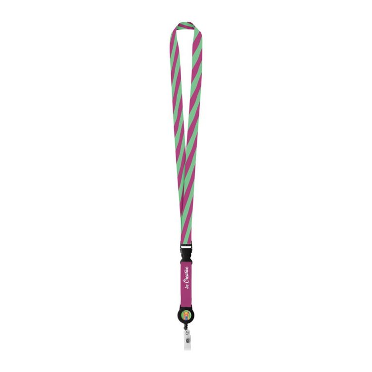 Tour de cou large en polyester avec porte-badges amovible avec bouton pression, cordelette télescopique. Grâce à la sublimation le logo peut être imprimé sur les deux côtés. Quantité minimale: 100 pcs