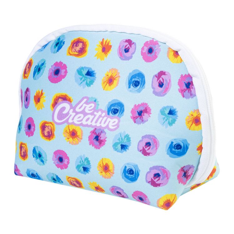Trousse de toilette zippée néoprène RPET avec une impression totale en sublimation. Labélisée RPET. Quantité minimale : 50 pièces.
