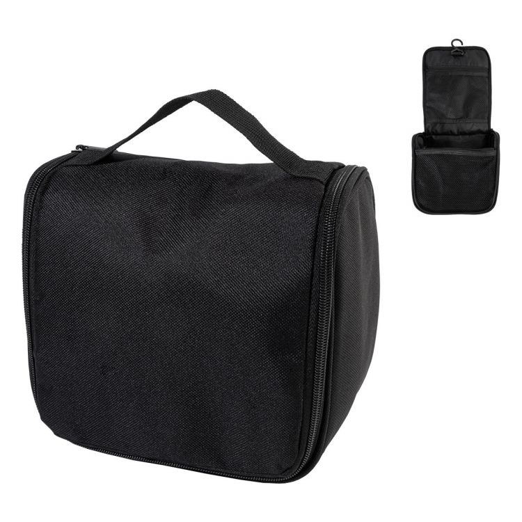 Trousse de toilette avec crochet en RPET avec compartiments intérieurs zippés et poches en filet. Polyester RPET 600D, labélisé RPET, de couleur noir