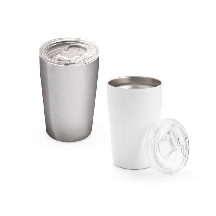 Verre de voyage pour sublimation avec double paroi en acier inoxydable. Comprend un couvercle transparent à ouverture coulissante. Peut contenir jusqu'à 380 mL. Fourni dans une boite cadeau