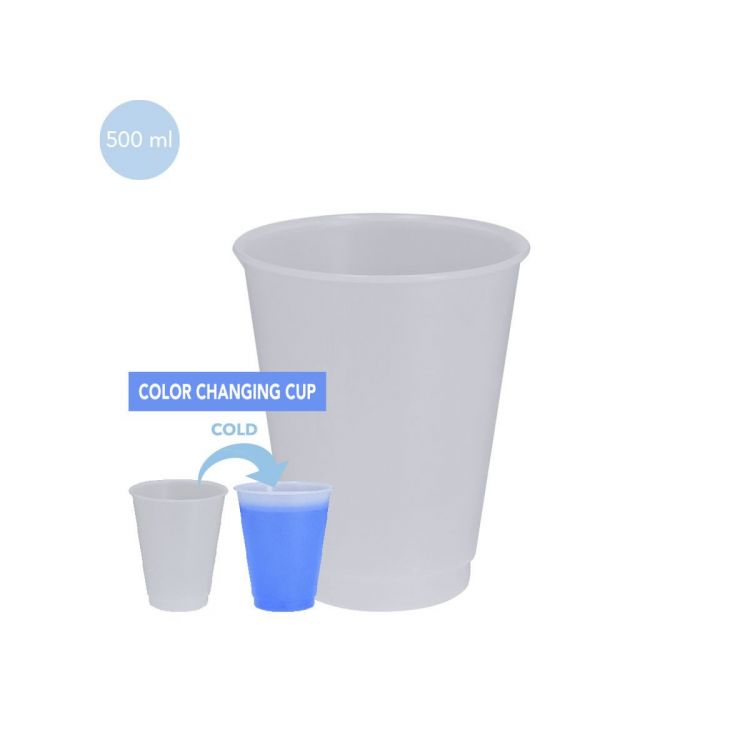 Gobelet changeant de couleur au contact de boissons froides. De capacité de 500 ml. Avec finition translucide mate et fabriqué en matériau PP résistant.